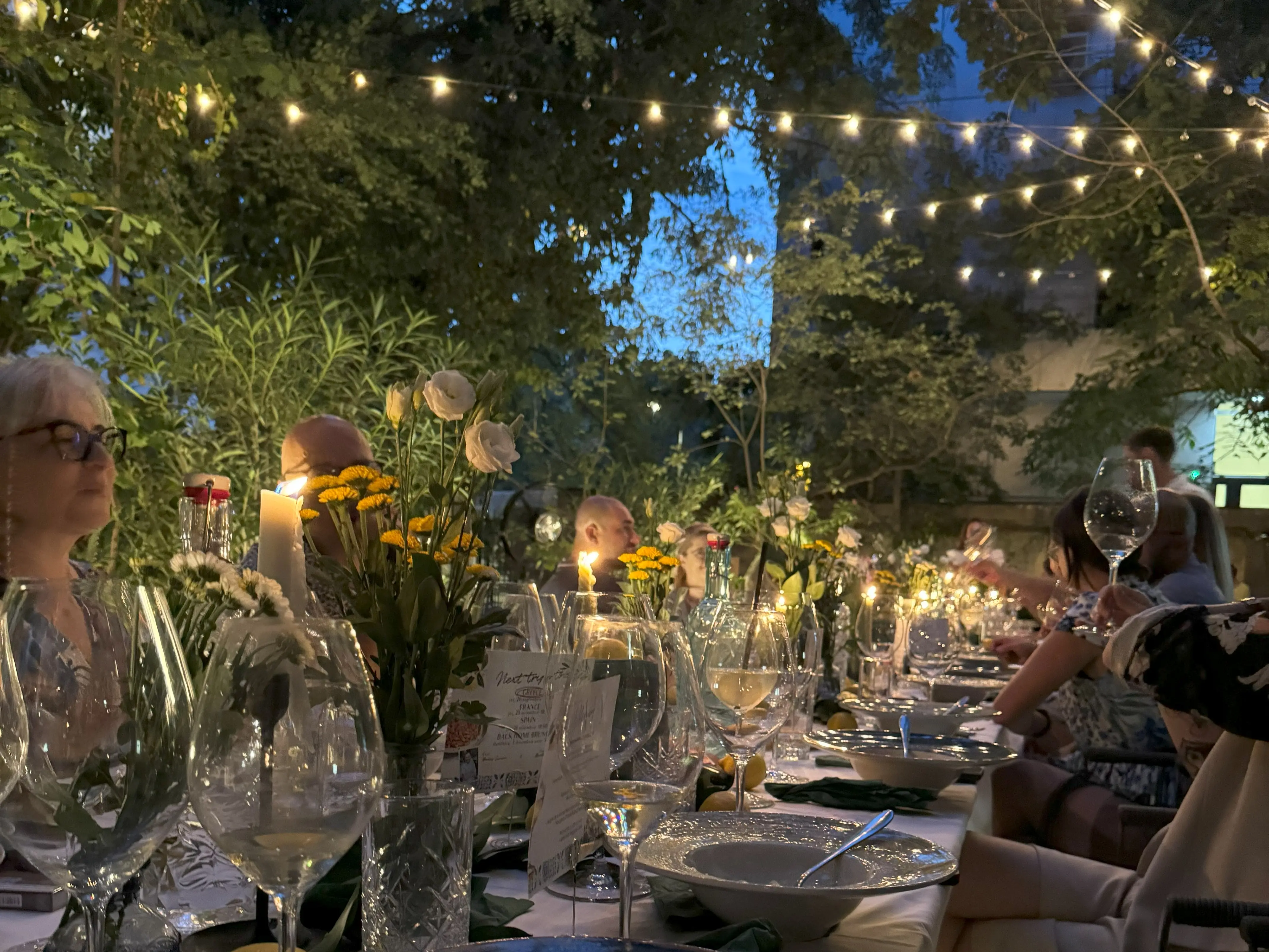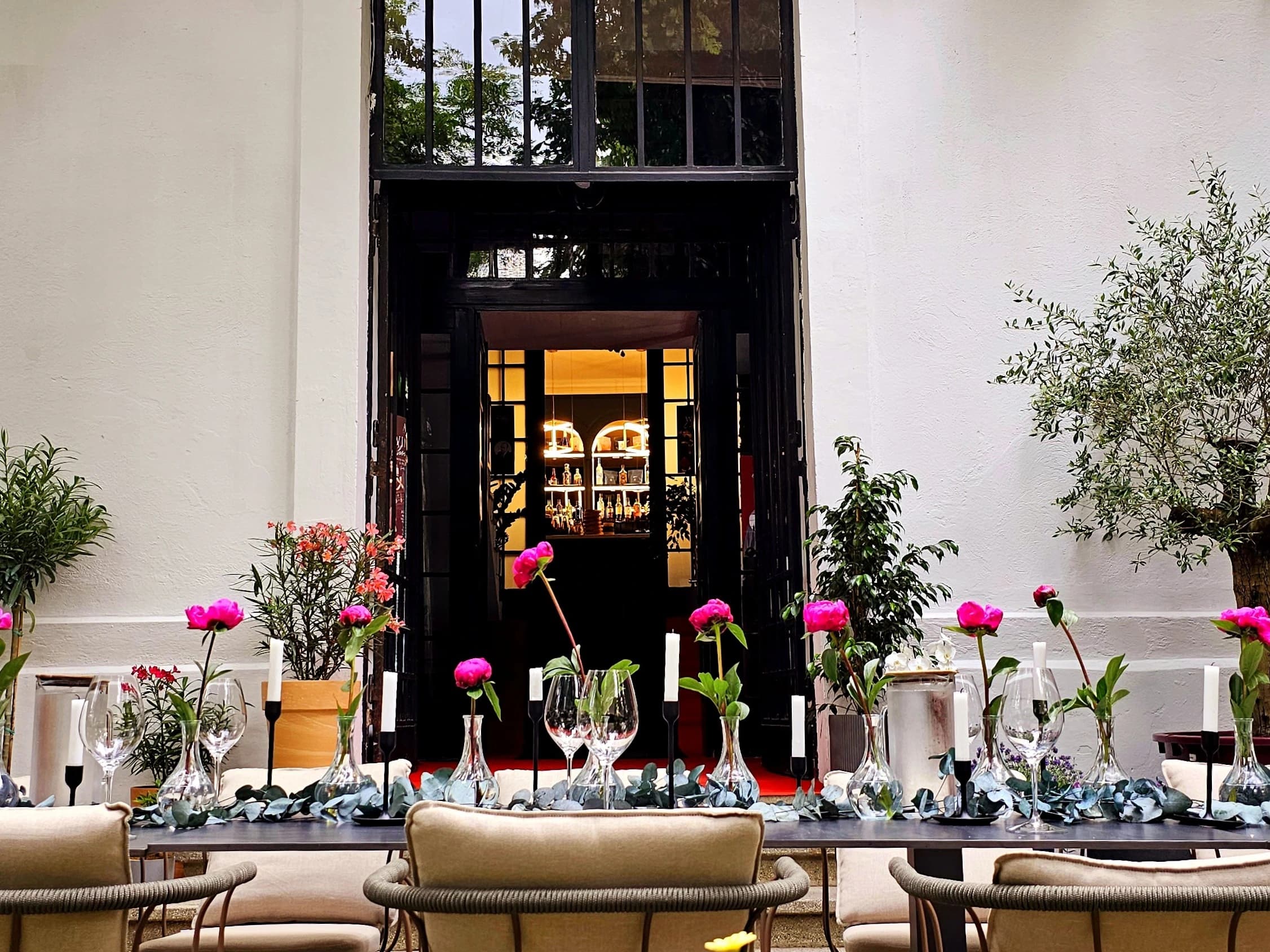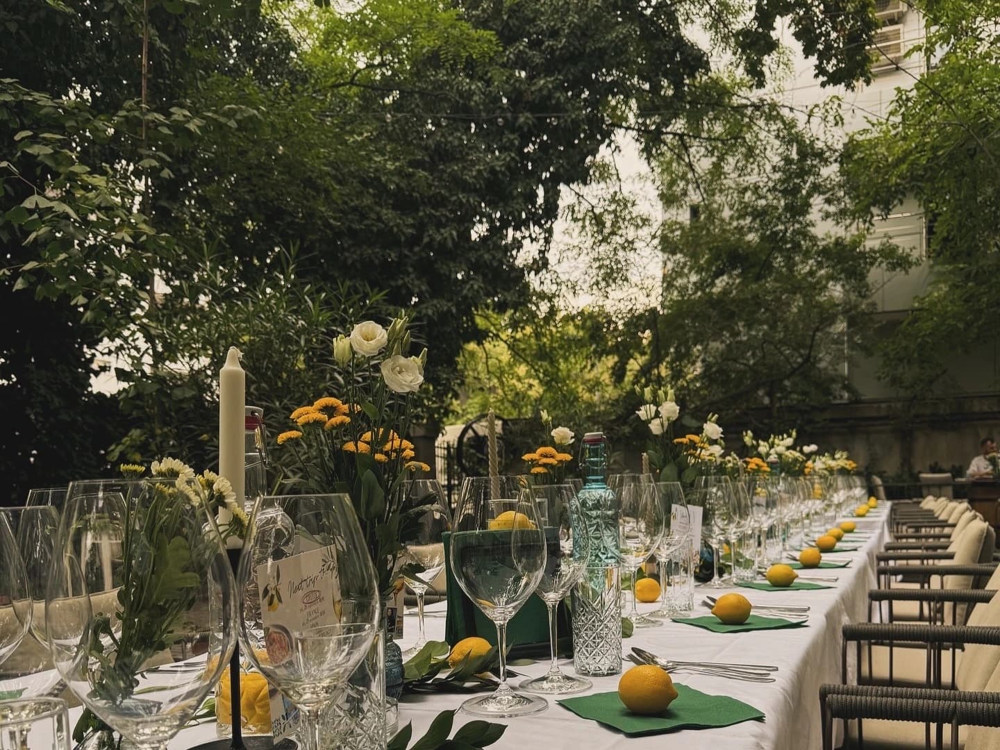 În exterior, grădina de 300 mp este un colț verde și răcoros, cu vegetație mediteraneană, iederă, măslini, portocali, leandri, perfectă pentru brunch-uri, ceremonii în aer liber sau cine relaxate sub lumini calde.